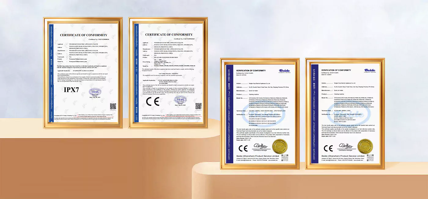 हमारी वॉशिंग मशीन और एयर कूलर ने ईयू परीक्षण मानकों को पारित कर दिया है और सीई प्रमाणीकरण प्राप्त किया है। बैटरी को IPX7 वॉटरप्रूफ रेटिंग प्राप्त है। हम घरेलू ई-कॉमर्स प्लेटफॉर्म और अलीबाबा पर एक उत्कृष्ट विक्रेता के रूप में भी प्रमाणित हैं।